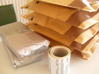 (The silver packets are felt bundles wrapped in tissue paper, in case you wondered!). My week doesn't have enough of a pattern to it to have fixed shipping days, so I end up doing a bit of packaging here and a bit of posting there but I am becoming increasingly organised with my shipping system. Over the past year I have turned into a serious "postal science" nerd, boring everyone with the correct way to address mail, "interesting" (to no-one but me) facts about customs regulations, and learning exactly the right time to go to the Post Office to avoid queues (not foolproof but spot on 90% of the time).
