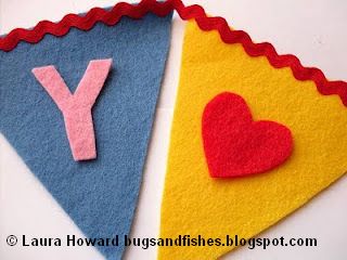 ... but if you're making the bunting for a special occasion (eg a birthday party), you can add some felt letters to make a fun banner. Cut out the letters you need (you may want to draw these on paper first to get the shapes right), taking care to use contrasting colours to the triangles the letters will appear on so they'll all stand out clearly.