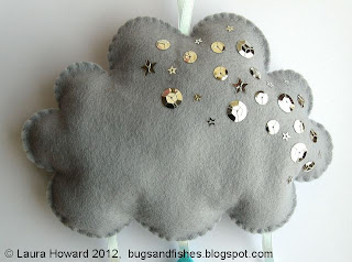 For the sparkly cloud, just sew on lots of silver sequins. You could use all one size and shape, or an assortment like I have, and use as many or as few sequins as you like in whatever arrangement you fancy! Use grey or white thread and three stitches per sequin.