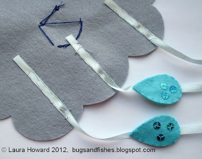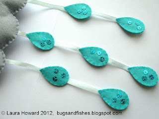 3) Decorate half your raindrops - either with blue buttons or blue sequins. Use matching blue thread to sew them in place, using three stitches per sequin and two or three stitches with double thickness thread per button.