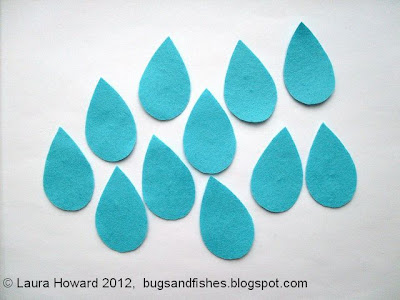 1) Use the templates provided to cut out two cloud shapes from grey or white felt, and lots of blue raindrops. You'll need two teardrop-shaped pieces for each raindrop you want on your mobile (I cut out 14 shapes to make 7 raindrops).