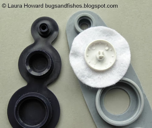 3. Now follow the instructions on your pack of cover buttons (or look online for a how to) and cover a button with your decorated circle of felt/fabric. Using a button covering tool makes it much easier to snap the front and back of the cover button together and the holes in the tool I use are very helpful for checking that the decoration on your button (in this case, the pupil and iris) are in the centre.