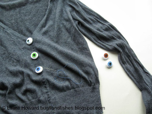 Then use a double thickness of sewing thread to sew on the eyeball buttons, sewing them securely in place through where the old buttons were. I left off the final button at the bottom as I preferred how it looked with just five buttons.
