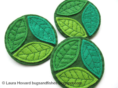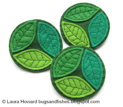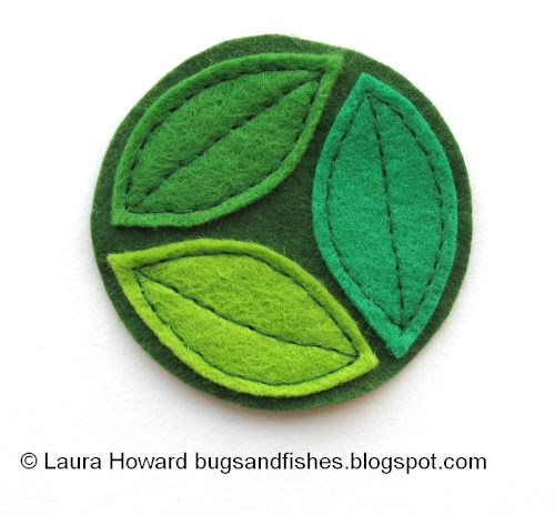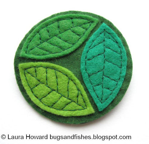 I've sewn my brooches in spring greens, but you could use orange/red/yellow on a brown background to make an autumnal version. Here's a crafty flashback to some I made many moons ago: