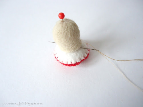 Sew the red and white circles together with red thread, using blanket stitch. Leave a tiny 1cm opening to insert the stuffing and sew up the gap when finished.