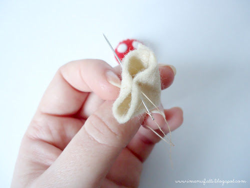 Cut out a beige stalk, a red circle and a white circle. Cut a tiny circle of white felt (approx. 6-7 mm) and use it as a template to cut out the other toadstool dots (I’ve used eight dots in total, for both toadstools). Whipstitch the dots on the red circle with matching thread.