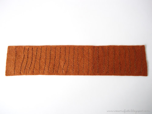 1. Print and cut out the templates. Pin the tree stump paper pieces on felt and cut a brown (russet) rectangle (the ‘body’), a brown circle and a fawn circle. Separate three strands of the brown embroidery thread and backstitch a series of lines on the ‘body’ shape, at an approx. distance of 1cm from each other (don’t stitch them perfectly straight!).