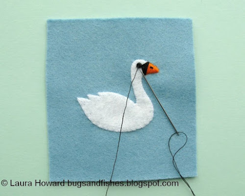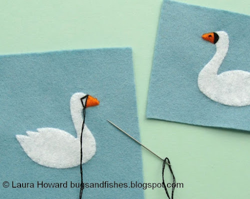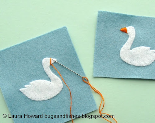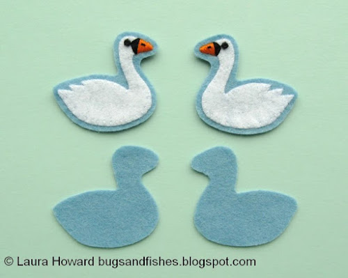 I chose light blue as a background to my swans as the white and orange both show up clearly against it and it looks like the swan is gliding on some water... but if you're making these to wear with a favourite outfit you could use backing felt that matches your garment instead.