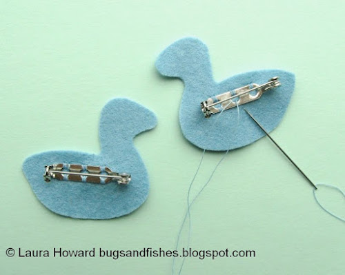 6. Turn over the backing pieces of felt. Add a brooch clasp to each shape near the top of the swan’s body, making sure you leave space to sew around the edge of the felt later. Sew the clasps in place with a double thickness of matching blue sewing thread.