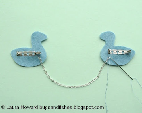 8. Place the swan backs in front of you so they are facing each other. Hold one end of the chain in position (just under the “inside” end of the brooch clasp, as pictured) and use a double thickness of blue thread to securely sew the end link of the chain to the felt. Repeat to sew the other end in position on the second swan back, joining the swans together.
