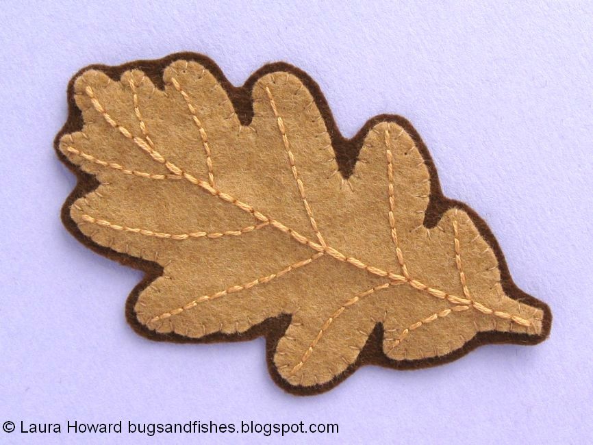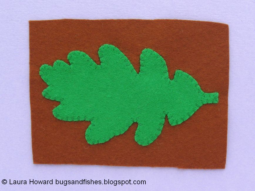 1. Use one of the templates provided (or your own leaf sketch) to cut out an oak leaf shape from brown or green felt. Place it on a piece of backing felt.