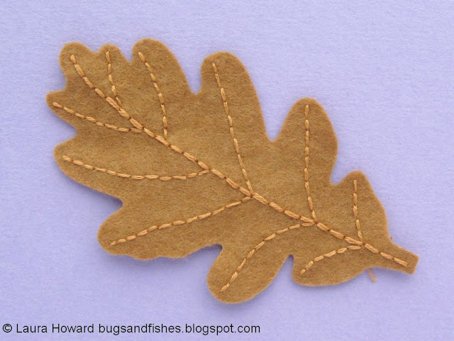 You can pin or tack the leaf in position or just hold it against the backing felt as you sew. I find it helpful to start sewing near the centre of the leaf instead of at one of the ends as this quickly makes the leaf more secure against the backing felt.
