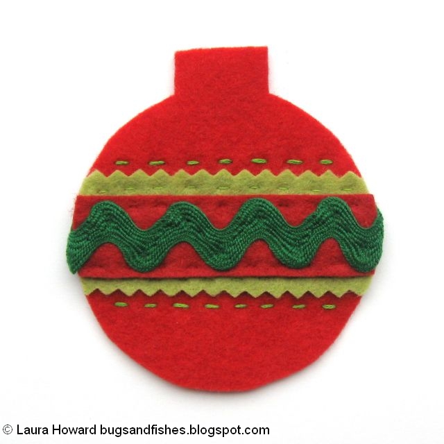 4. Start by adding ribbon and/or ric-rac. To add each piece, cut a length slightly wider than the bauble (so it overhangs the edges by 1-2 cm at each side). Pin or hold the ribbon/ric-rac in place and sew along it with matching sewing thread. You can use running stitch, or sew tiny whip stitches along the edges. Fold the ends of the ribbon / ric-rac over and secure it at the back of the bauble shape with a few whip stitches, sewing into the felt but not through it.