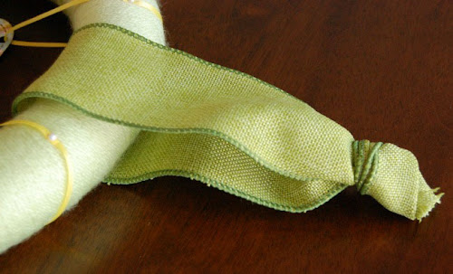 6. Cut a 15cm (6 inch) length of narrow white ribbon. Fold the ribbon into a loop and sew the ends to the top of the undecorated bauble shape. Use whip stitch and red sewing thread, sewing into the felt not through it.
