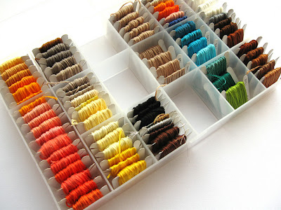 As well as knitting simple blanket squares when I was a little under the weather, I wound lots of skeins of embroidery floss onto bobbins and filed them neatly in my thread boxes. I've bought quite a few new colours lately, so my thread collection has expanded from one box to two: