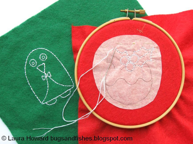Tip: you'll be sewing around the bauble later on so you can leave the bottom edge of the snowman's body (where it follows the curve of the bauble) unstitched until then.