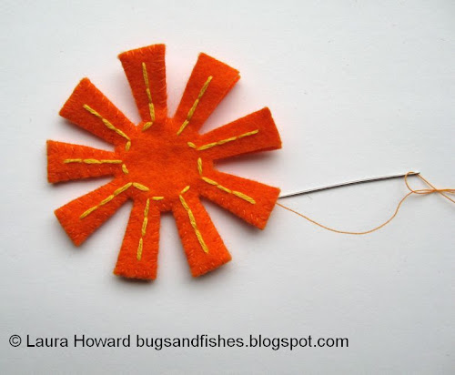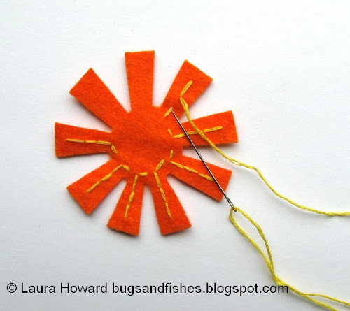 2. Cut a length of yellow embroidery floss and separate half the strands (so for six stranded floss use three strands). Use running stitch to sew a line most of the way down each ray: sew out from the centre and then fill in the gap(s) as you sew back again, then stitch your way to the bottom of the next ray and repeat.