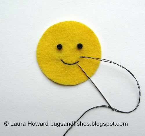 4. Sew two black seed beads onto one of the yellow suns, sewing each bead flat like an O with three or four stitches of black sewing thread. Then use a double thickness of black thread to backstitch a smile.