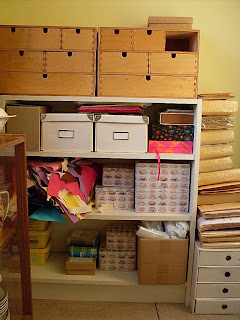 Yesterday I finally got my new "office" space tidied up and cleared of junk piles and laundry and other gubbins. It's nothing fancy, just some shelves in a little room off our kitchen (which acts as my main office/workspace) but it means I finally have 90% of my crafty stuff organised and together in one place for ease of sewing / packaging / etc. Click on the photo to see it labelled on Flickr...