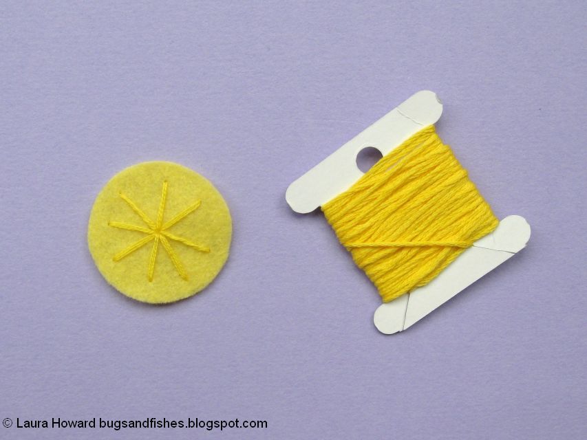 3. Add some embroidery to each felt circle. Cut a length of embroidery thread to match the felt, and separate half the strands (so for six-stranded thread use three strands). Use the embroidery thread to sew single stitches radiating from the centre of each circle, as shown. Sew seven or eight stitches for the daffodils, and five or six stitches for the narcissi.